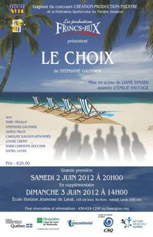 Saison 2012 Le choix, présenté les2 et 3 juin 2012 à l'école Horizon-Jeunesse ; le 16 juin 2012 au théâtre la Grangerit dans le cadre du festival des Molières ; le 3 août 2012 au centre de la nature dans le cadre des Festi'Week-end.